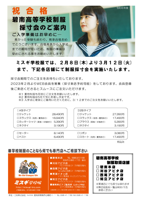 お知らせ 令和7年度 全日制課程入学生の皆様へ(制服について) 2025年3月11日 制服を各販売店で3月16日(日)までに御購入をお願いします。詳しくは各販売店のホームページを確認してください。 ミスギ学校服 大黒屋 ファッションショップ あさひや